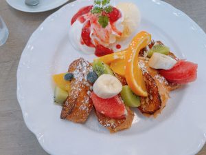 私はこのフルーツフレンチトーストにしたのですが、パンもふわふわだしフルーツも盛りだくさんだしで